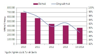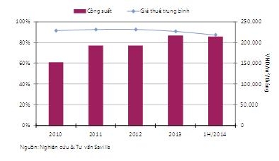 Công suất thuê toàn thị trường giảm -1 điểm % so với năm 2013 xuống 86%, trong khi đó giá thuê trung bình giảm -4% xuống 218.000đồng/m²/tháng. Trong đó, công suất thuê hạng A đạt 94%, tăng nhẹ 1 điểm % so với năm ngoái, trong khi hạng B ổn định ở mức 86%. Công suất hạng C đạt 84%, giảm -1 điểm % so với 2013.