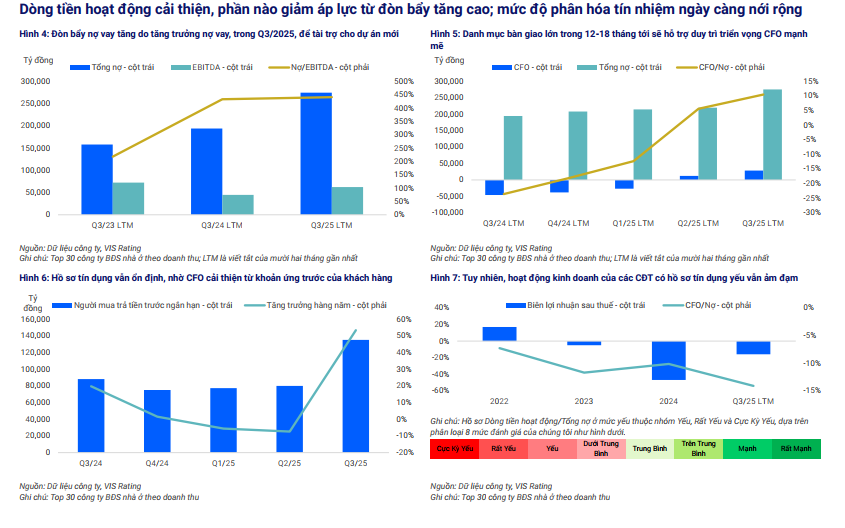 Ngược lại, bức tranh không mấy sáng sủa dành cho các chủ đầu tư vướng pháp lý hoặc hoạt động trì trệ như LDG, NRC và NVL. Trong 9 tháng đầu năm 2025, nhóm này duy trì biên lợi nhuận yếu và dòng tiền khiêm tốn khiến hồ sơ tín dụng ở mức thấp. Diễn biến này góp phần mở rộng mức độ phân hóa tín nhiệm của ngành nhà ở.