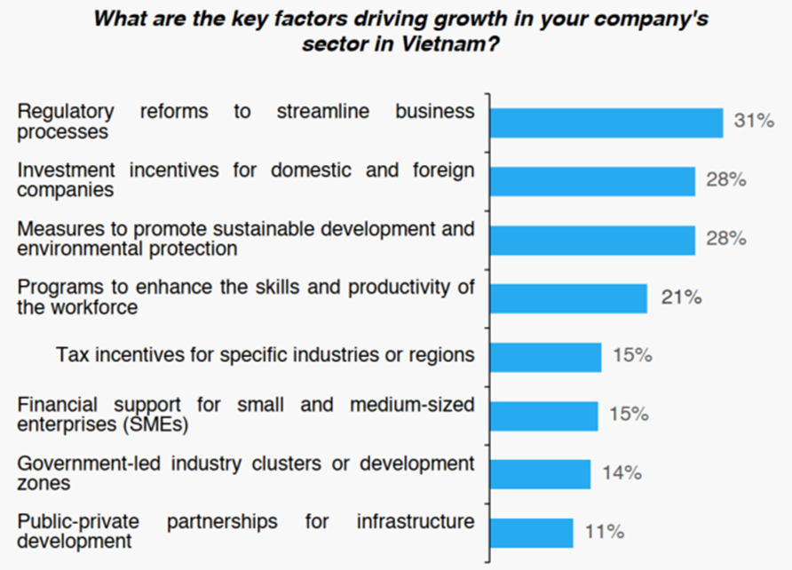 Thông qua một loạt các sáng kiến chiến lược nhằm cải thiện môi trường kinh doanh, Việt Nam nổi lên như một điểm đến hàng đầu cho vốn đầu tư nước ngoài cũng như các doanh nghiệp trong nước. Dựa trên phản hồi từ những người tham gia khảo sát, việc đơn giản hóa quy định, các biện pháp phát triển bền vững, khuyến khích đầu tư và các chương trình phát triển lực lượng lao động đóng vai trò quan trọng trong việc tạo điều kiện cơ bản cho thành công kinh tế dài hạn.