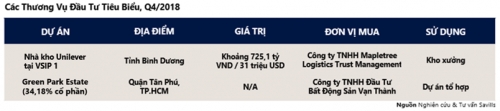 Các chủ đầu tư phân khúc nhà ở tiếp tục hoạt động tích cực trong Q4/2018. Công ty TNHH VinaCapital Opportunity Fund (VOF) chuyển giao 34,18% cổ phần của Green Park Estate, một dự án tổ hợp với quy mô 15,7ha tại quận Tân Phú, TP.HCM.