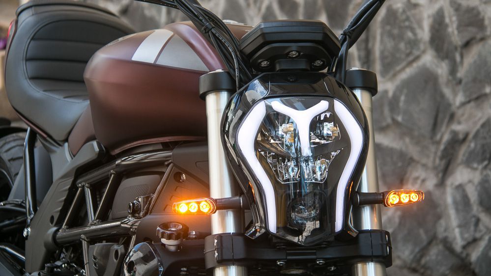 Đầu xe nổi bật với hệ thống đèn chiếu sáng full LED cho đèn pha và các đèn tín hiệu khác. Trong đó, đèn pha hình lục giác cách điệu cỡ lớn được đặt ngay tại trung tâm yếm xe. Đặt ngay bên cạnh là đèn xi-nhan kéo dài với dải LED trắng hiện đại.