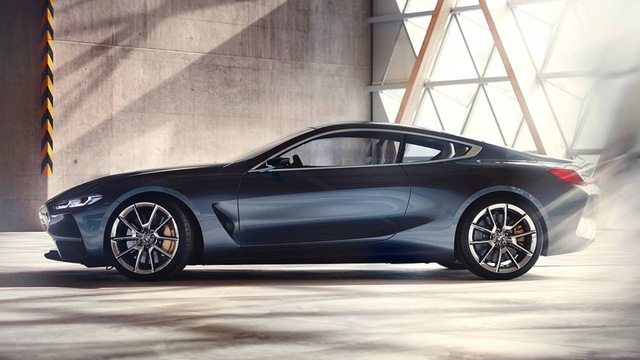 Nhìn ngang hông xe có thể thấy dáng vẻ tổng thể hoàn toàn được giữ nguyên, chẳng hạn như đường cong của trần xe hay cửa sổ bên, tuy nhiên 8-Series hoàn chỉnh có nhiều chi tiết thực tiễn hơn như hốc gió hông hay cụm đèn hậu.