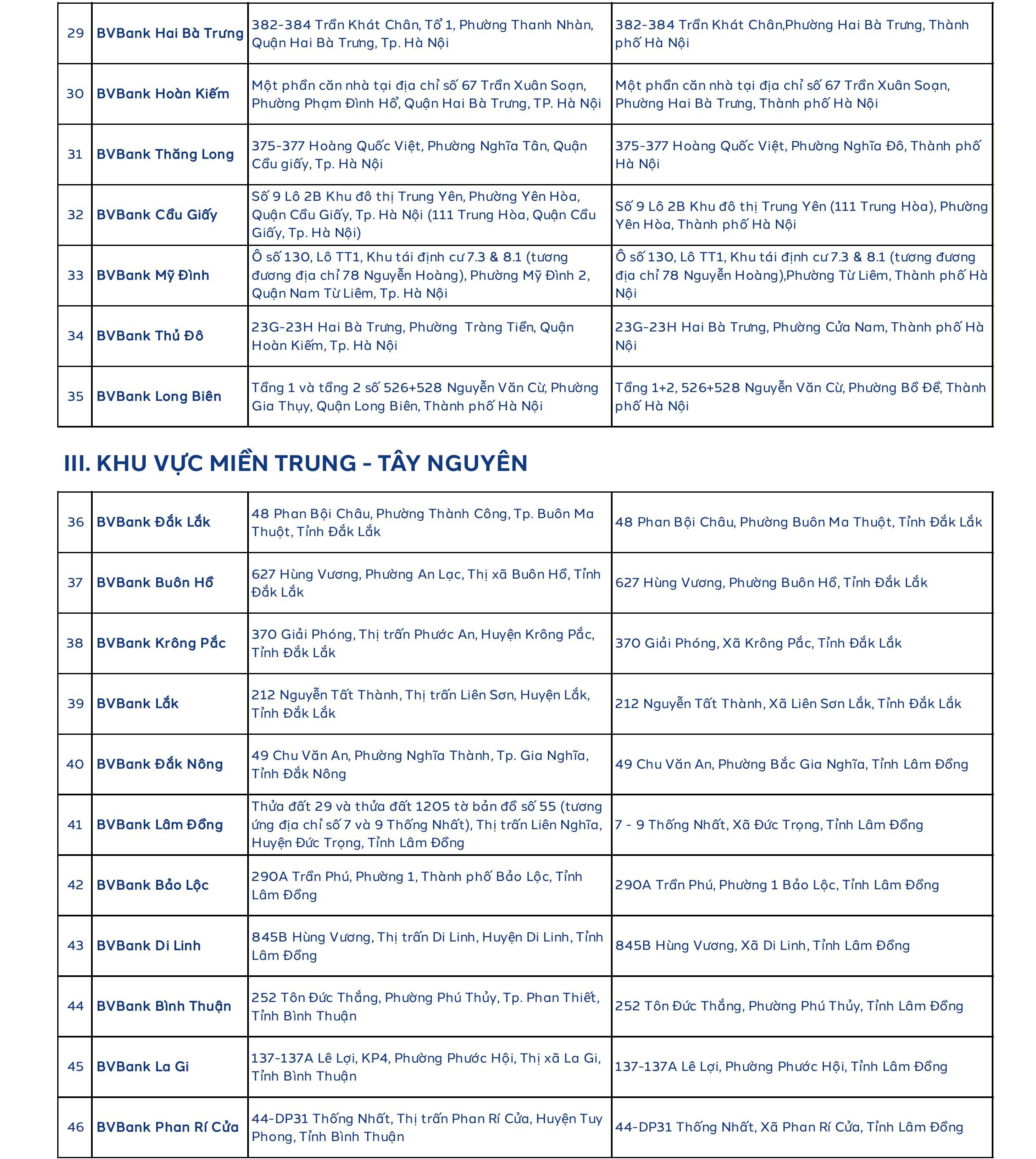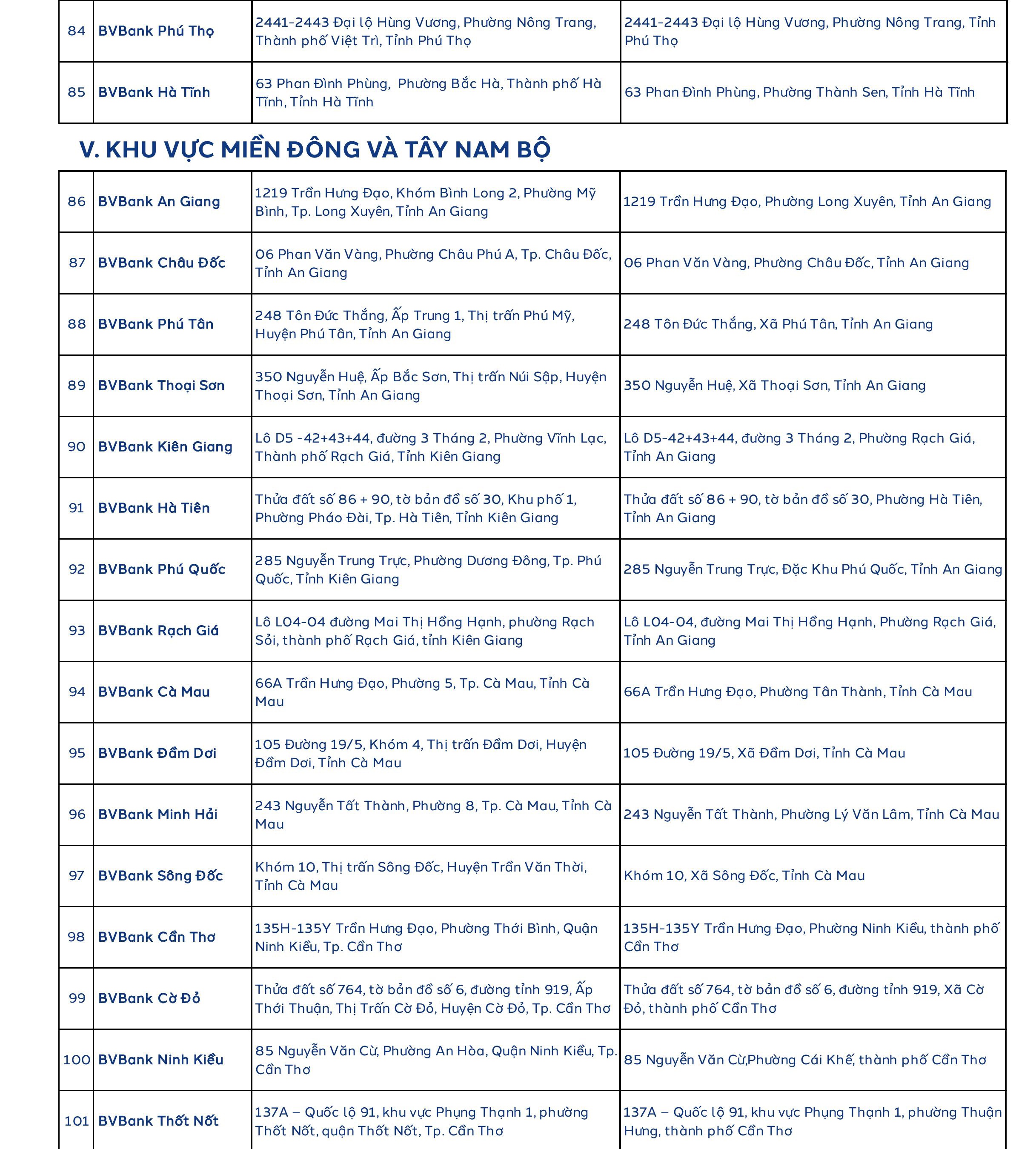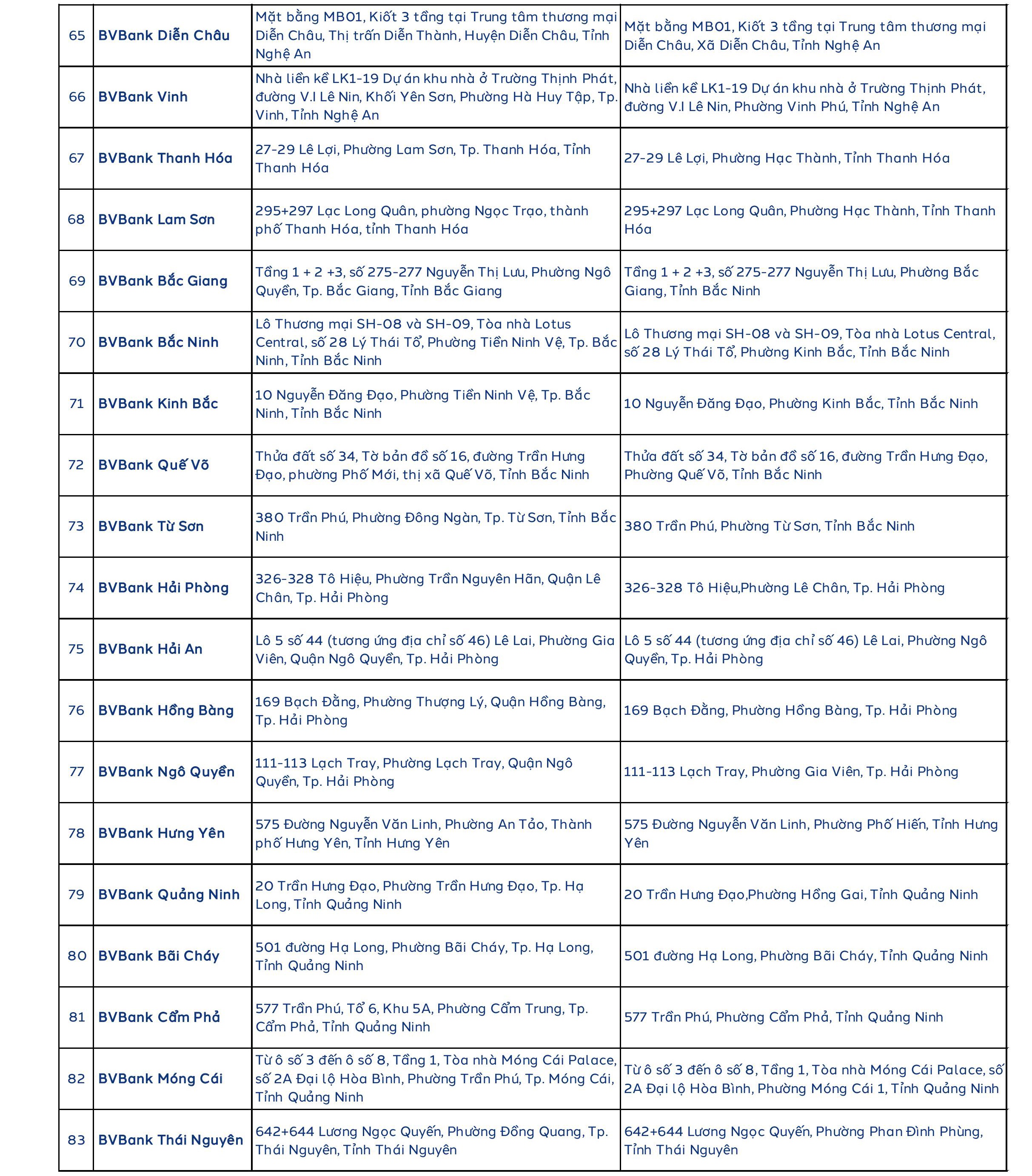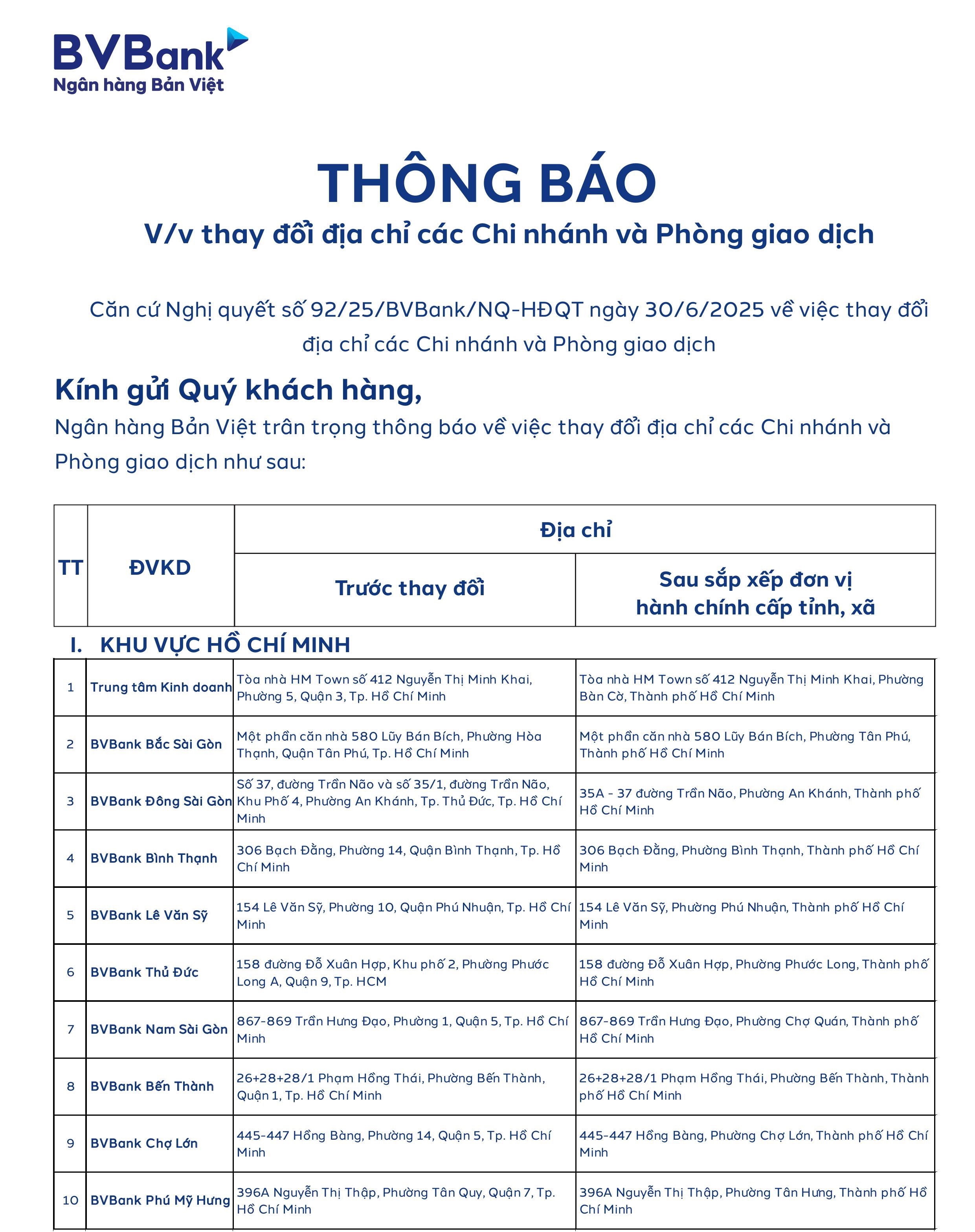 BVBank: Thông báo thay đổi địa chỉ các Chi nhánh và Phòng giao dịch