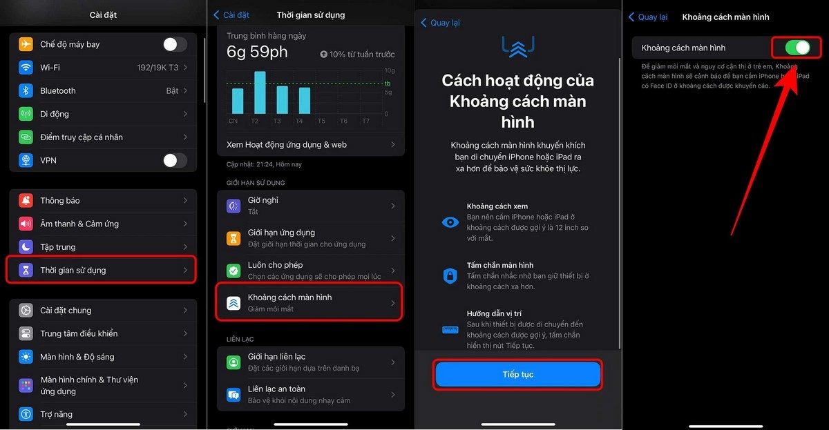 Vào Cài đặt > Chọn Thời gian sử dụng > Khoảng cách màn hình > Bấm Tiếp tục với các cửa sổ hướng dẫn > Bật khoảng cách màn hình.