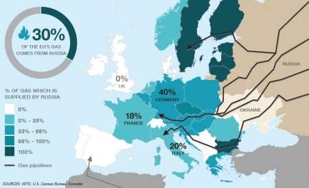Với Liên minh châu Âu (EU), nguồn năng lượng cung cấp từ Nga rất quan trọng khi có tới 1/3 sản lượng khí đốt của Nga được xuất khẩu vào EU. Trong đó, riêng với Đức – nền kinh tế lớn nhất khu vực Eurozone – nhập khẩu tới 40% nhu cầu khí đốt của họ từ Nga.