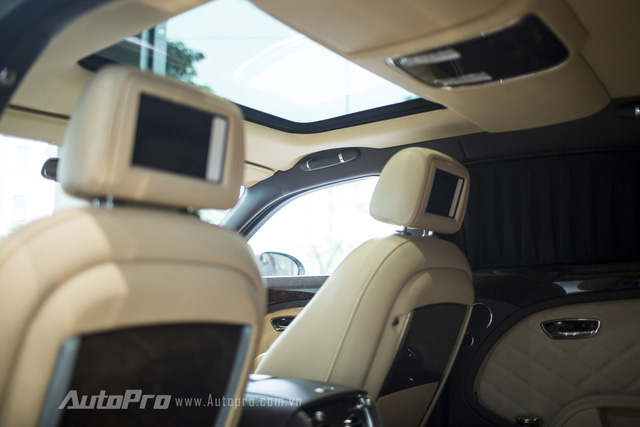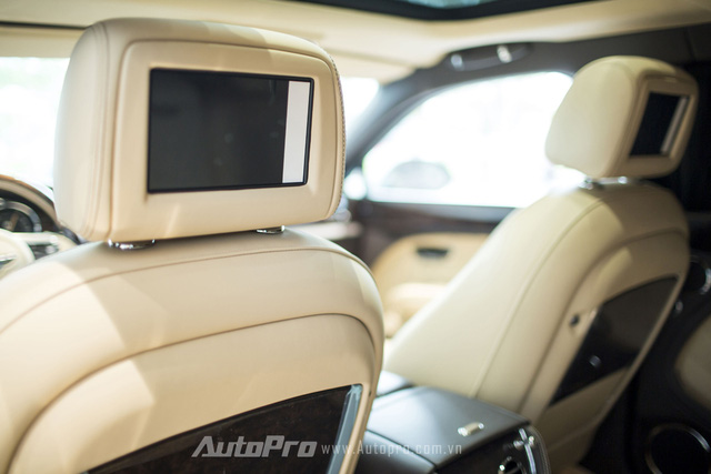 Trên tựa đầu của ghế trước là 2 màn hình hiển thị thông tin. Ngay sau lưng ghế lái và ghế phụ là bàn làm việc được gập gọn gàng. Trong phiên bản Bentley Mulsanne Speed 2016 về Việt Nam lần này còn có 2 máy tính bảng iPad được tích hợp bên dưới mặt bàn này.
