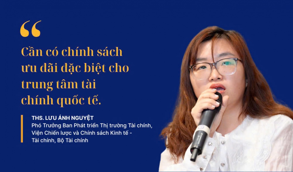 | ThS. Lưu Ánh Nguyệt, Phó Trưởng Ban Phát triển Thị trường Tài chính, Viện Chiến lược và Chính sách Kinh tế - Tài chính, Bộ Tài chính cho rằng cần có những chính sách ưu đãi đặc biệt để thu hút đầu tư cho trung tâm tài chính quốc tế tại Việt Nam. |
