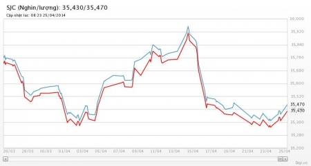 Công ty Vàng bạc đá quý Sài Gòn (SJC) cũng mở cử sáng nay với mức giá mua – bán vàng SJC tại TP.HCM là 35,42 – 35,48 triệu đồng/lượng; còn tại Hà Nội và một số địa phương khác là 35,42 – 35,50 triệu đồng/lượng. Như vậy giá mua - bán của SJC cũng đã tăng thêm 70.000 đồng/lượng so với cuối giờ chiều qua.