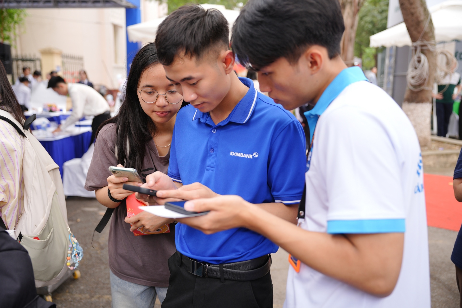 | Gian hàng của Eximbank thu hút rất đông các bạn sinh viên đến tìm hiểu cơ hội nghề nghiệp |