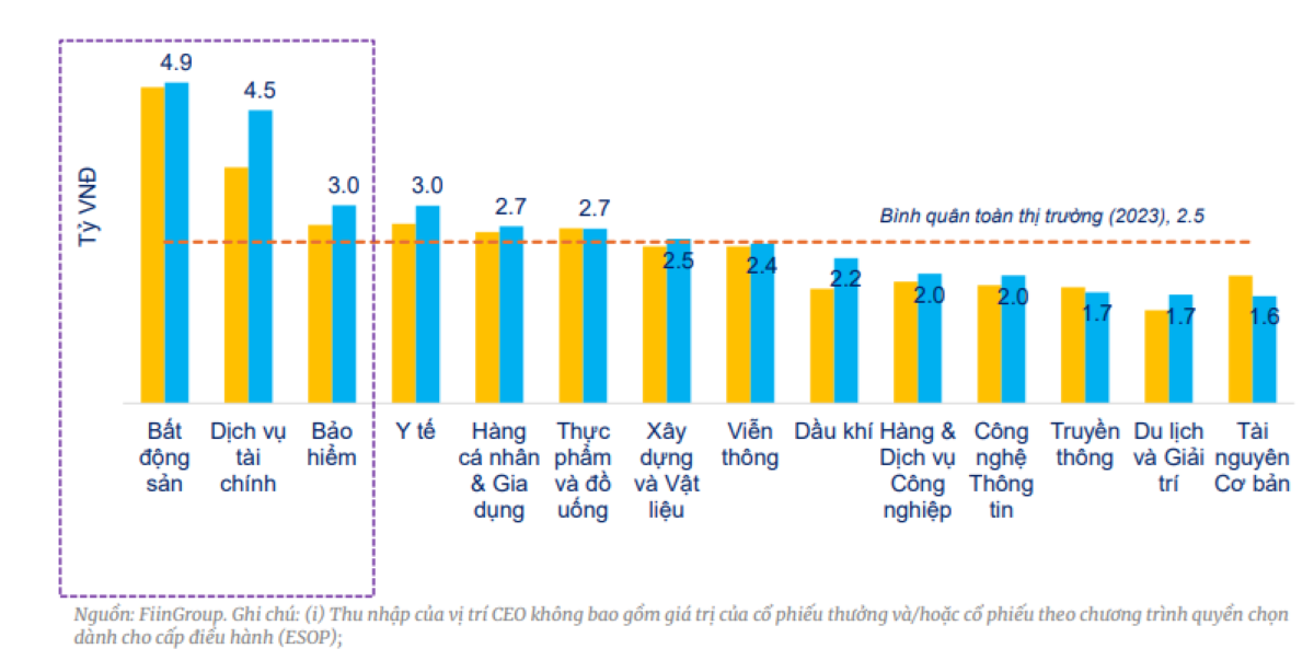 Theo báo cáo của FiinGroup, thu nhập của CEO: Thu nhập bình quân ở mức 2,5 tỷ đồng/năm/người trong năm 2023. Trong đó, bất động sản, dịch vụ tài chính (chủ yếu là công ty chứng khoán), và bảo hiểm là Top 3 ngành có thu nhập bình quân của CEO cao nhất, vượt trội so với mức bình quân của thị trường.
