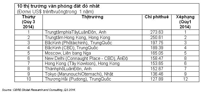 Theo đó, để thuê được một mét vuông tại Khu vực trung tâm phía Tây London, khách hàng phải trả tới 274 USD. Đứng thứ hai là khu vực trung tâm Hong Kong với 251 USD/m2.