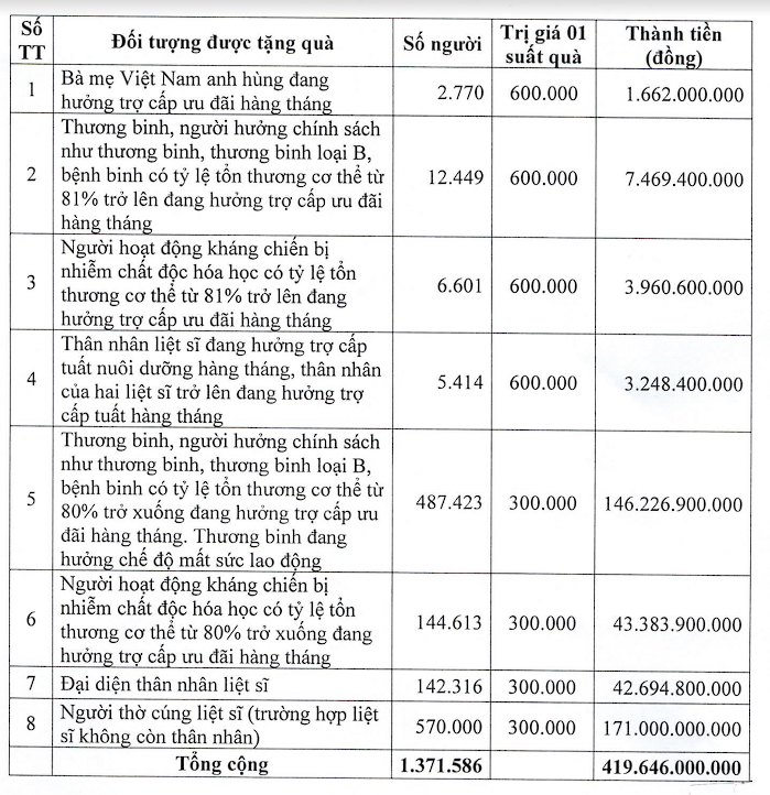 Cụ thể, mức quà 600.000 đồng dành tặng cho các đối tượng dưới đây.