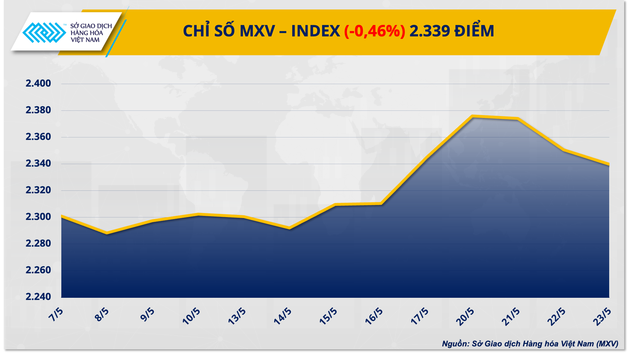 Sắc đỏ phủ kín bảng giá năng lượng và kim loại. Trong khi đó, lực mua áp đảo trên nhóm nguyên liệu công nghiệp và nông sản. Tuy nhiên, lực bán có phần chiếm ưu thế khiến chỉ số MXV-Index chốt ngày giảm 0,46% xuống 2.339 điểm, nối dài đà giảm sang ngày thứ ba liên tiếp. Giá trị giao dịch toàn Sở đạt gần 6.300 tỷ đồng.