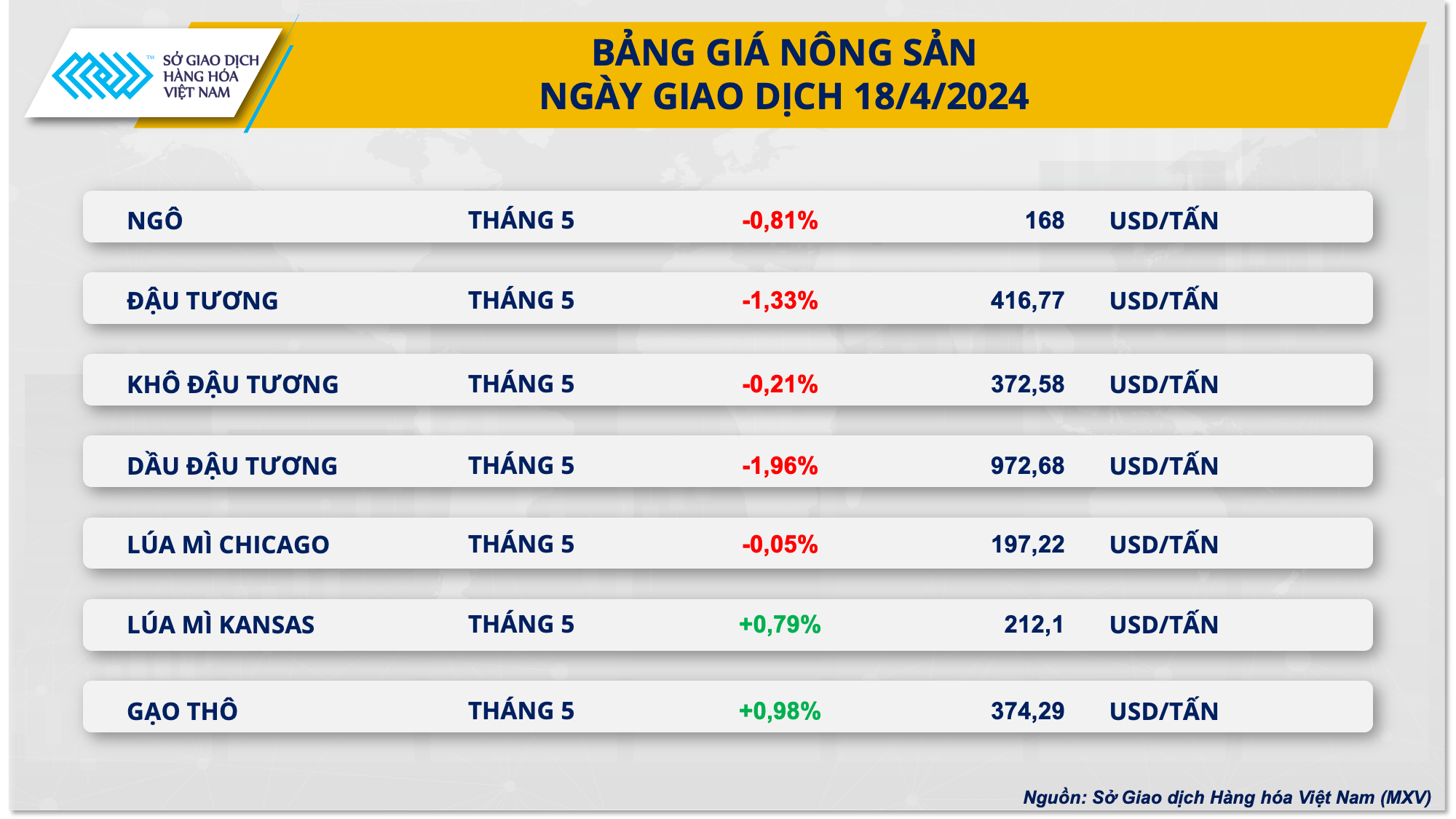 Nhóm nông sản và năng lượng chịu áp lực mạnh. Trong khi đó, đà tăng áp đảo đối với nhóm nguyên liệu công nghiệp và kim loại. Chốt ngày, lực mua có phần chiếm ưu thế đã hỗ trợ chỉ số MXV-Index đóng cửa ngày 18/4 hồi phục nhẹ 0,16% lên 2.304 điểm, kết thúc chuỗi suy yếu 3 ngày liên tiếp.