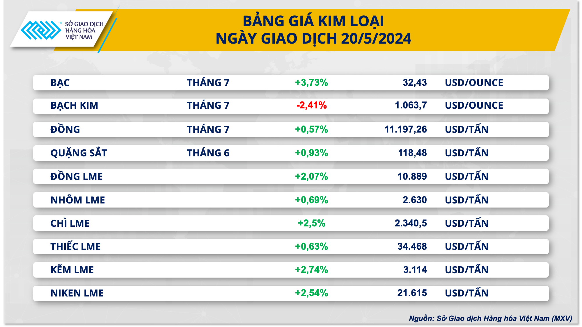Nhóm kim loại mở rộng đà tăng trong suốt gần 2 tuần trở lại đây. Kết thúc ngày 20/5, ngoại trừ bạch kim, tất cả 10 mặt hàng còn lại đều tăng giá. Đối với kim loại quý, giá bạc nối dài đà tăng sang phiên thứ năm liên tiếp, với mức tăng 3,73% lên 32,42 USD/oz, vững vàng neo ở vùng đỉnh 11 năm. Ngay từ đầu phiên giao dịch hôm qua, giá bạc đã bật tăng mạnh nhờ phát huy tốt vai trò trú ẩn an toàn khi bất ổn địa chính trị gia tăng tại Trung Đông. Kim loại quý luôn được coi là hàng rào trú ẩn mỗi khi nền kinh tế có biến động. Do vậy, lo ngại bất ổn địa chính trị gia tăng đã thúc đẩy nhu cầu tích trữ kim loại quý, hỗ trợ giá bạc tiếp tục tăng mạnh.