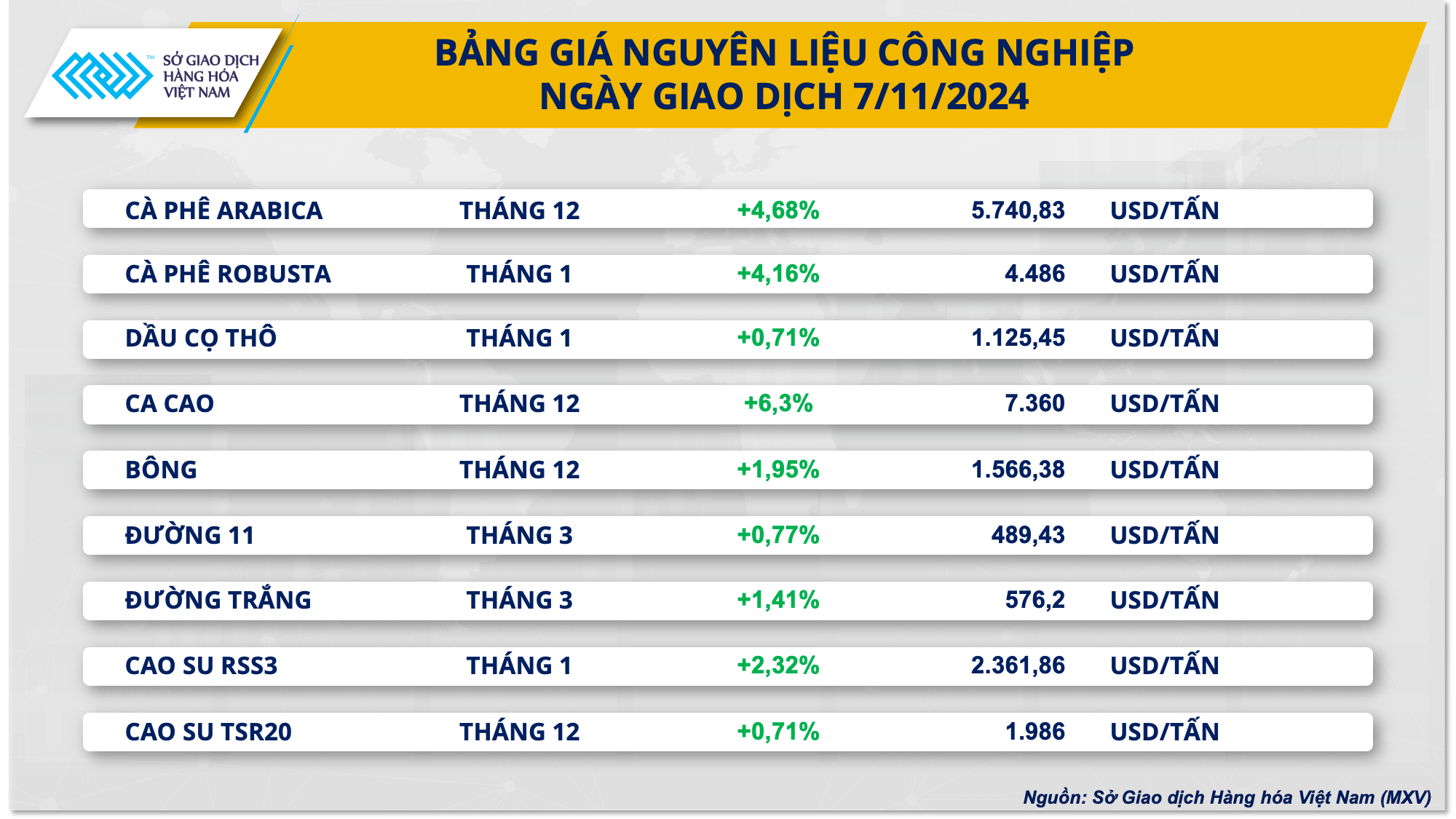 Khép lại phiên giao dịch ngày 7/11, sắc xanh bao trùm trên bảng giá các mặt hàng nhóm nguyên liệu công nghiệp. Cụ thể, giá cà phê Arabica tăng vọt 4,7%, lên mức cao nhất gần một tháng qua và giá cà phê Robusta cao hơn 4,2% so với tham chiếu nhờ sự dịch chuyển dòng tiền liên thị trường.