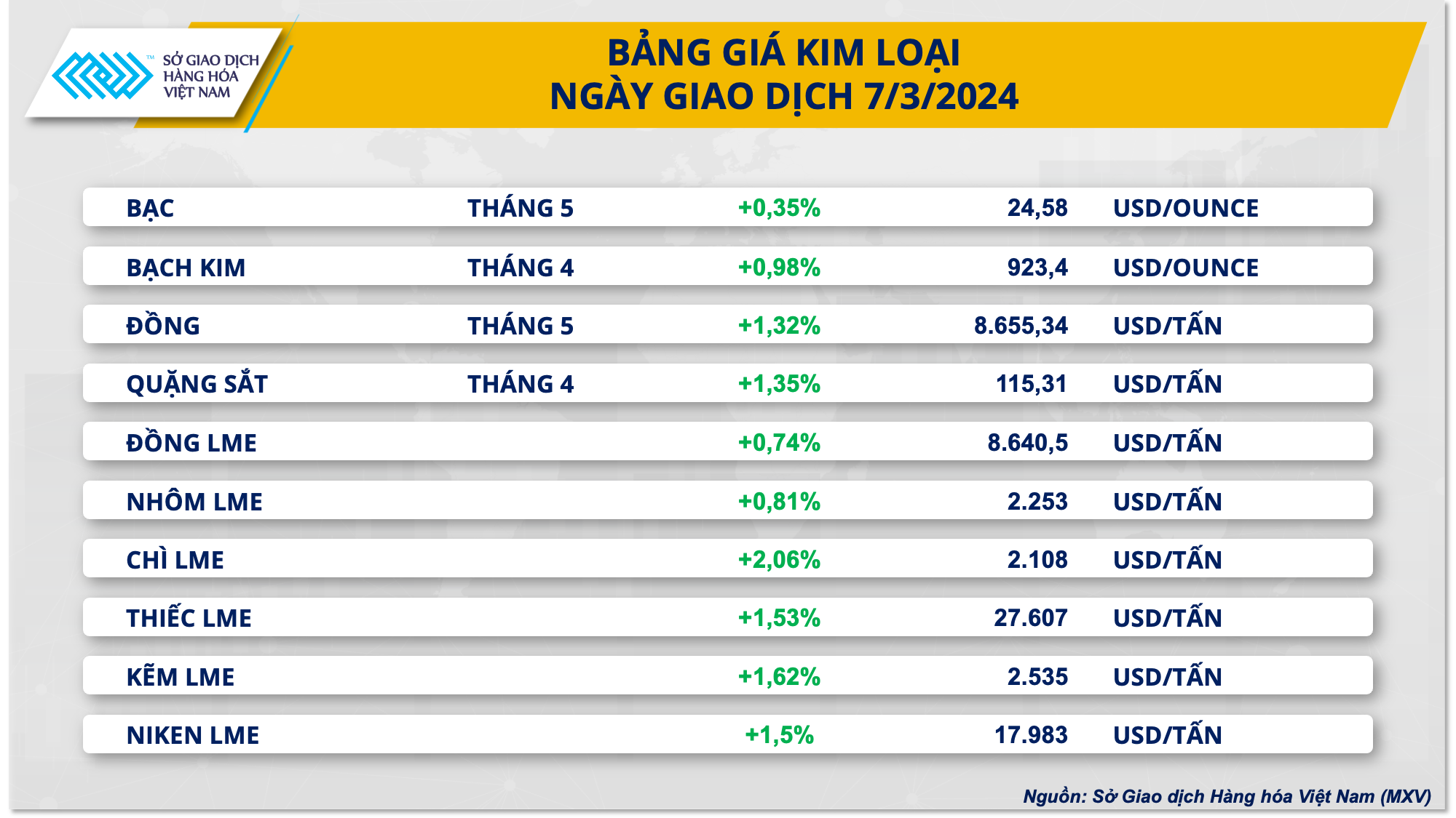 Đáng chú ý, giá hai mặt hàng nhóm nguyên liệu công nghiệp là cà phê và bông tăng vọt, trong đó giá cà phê Robusta thiết lập kỷ lục mới trong vòng 30 năm. Bên cạnh đó, 10/10 mặt hàng kim loại cũng nổi bật trong sắc xanh.
