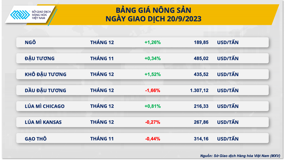 Hai mặt hàng thành phẩm của đậu tương diễn biến trái chiều trong hôm qua. Giá khô đậu tương hợp đồng tháng 12 nối tiếp đà hồi phục từ phiên trước đó và khép lại phiên hôm qua với mức tăng lên tới 1,52%, chủ yếu nhờ giá đậu tương. Ngược lại, dầu đậu tương là mặt hàng duy nhất đóng cửa trong sắc đỏ khi giảm tới 1,66%. Sự suy yếu của giá dầu cọ và giá dầu thô đã gây áp lực lên giá dầu đậu.