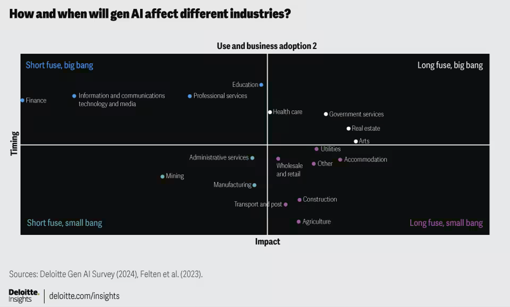 Để giải thích rõ hơn về tác động của GenAI đối với khu vực châu Á - Thái Bình Dương, Deloitte Access Economics đã tiến hành nghiên cứu và phân tích 18 ngành nghề dựa trên mức độ tác động của GenAI và thời gian mà các ngành đó sẽ bị ảnh hưởng. Ước tính, 5 nghìn tỷ USD là con số mà hoạt động kinh tế trong các ngành sẽ phải đối mặt với một viễn cảnh bùng nổ trong thời gian ngắn.