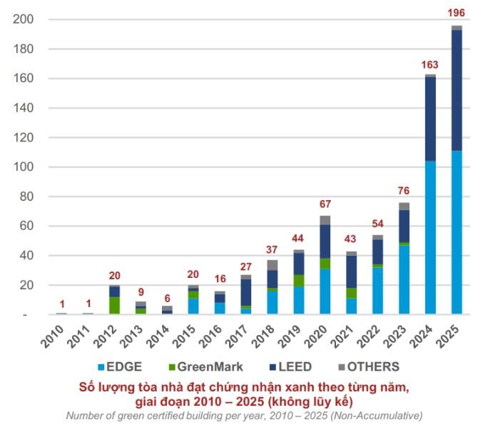Theo số liệu tổng hợp từ Tổ chức Tài chính quốc tế (IFC), tính đến ngày 31/12/2025, Việt Nam đã có tổng cộng 780 tòa nhà đạt chứng nhận xanh, tương ứng với hơn 18,6 triệu m2 sàn. Riêng trong năm 2025, thị trường ghi nhận 196 tòa nhà mới đạt chứng nhận (tăng 20% về số lượng), tương đương 4,4 triệu m2 sàn (tăng 15% về diện tích sàn so với năm 2024). Đây là mức tăng kỷ lục so với các năm trước, thể hiện nỗ lực của ngành xây dựng trong việc hướng tới một Việt Nam xanh hơn.