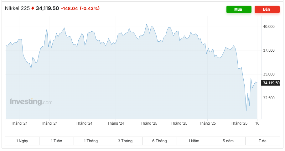 | Chỉ số Nikkei 225 đang giao dịch thấp hơn mức giá đóng cửa phiên hôm trước |
