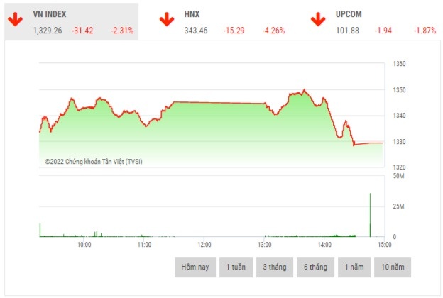 VN-Index đóng cửa tại mốc gần như thấp nhất trong ngày hình thành nên một cây nến đỏ đặc. Đáng nói, VN-Index gần như không xuất hiện lực cầu vào trong phiên chiều. Áp lực bán dâng cao và kéo chỉ số chính sàn HOSE bốc hơi hơn 31 điểm khi đóng cửa.