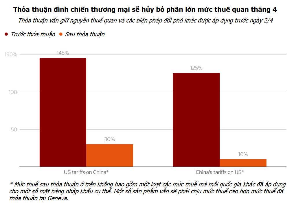 Theo thỏa thuận, trong ba tháng tới, Mỹ sẽ hạ mức thuế bổ sung áp đặt vào tháng trước đối với hàng hóa nhập khẩu từ Trung Quốc từ 145% xuống còn 30%. Đáp lại, Trung Quốc cũng sẽ giảm thuế nhập khẩu hàng hóa Mỹ từ 125% xuống 10%.