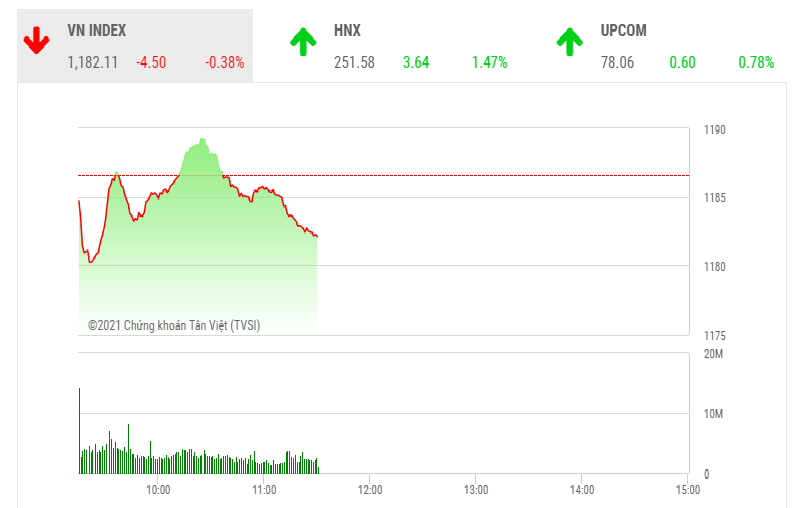 Kết thúc phiên sáng 3/3, VN-Index giảm 4,5 điểm (-0,38%) xuống 1.182,11 điểm. Toàn sàn có 203 mã tăng, 224 mã giảm và 64 mã đứng giá.