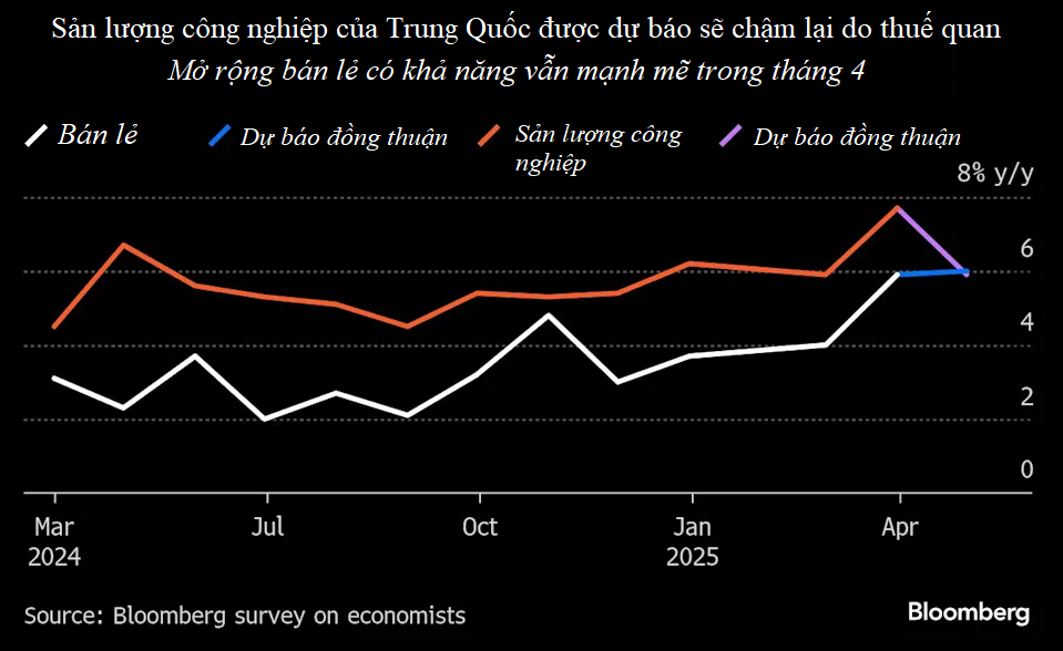 Cuộc khảo sát được tiến hành vào thứ Tư và thứ Năm với sự tham gia của 22 chuyên gia, cho thấy niềm tin vào khả năng đàm phán thương mại nhanh chóng nhằm tháo gỡ các biện pháp thuế mà ông Trump áp đặt là rất thấp. Một cuộc khảo sát riêng biệt dự báo, dữ liệu chính thức công bố vào thứ Hai tới sẽ cho thấy sản lượng công nghiệp của Trung Quốc trong tháng 4 tăng chậm lại, khi các mối đe dọa từ thuế quan đè nặng lên xuất khẩu.