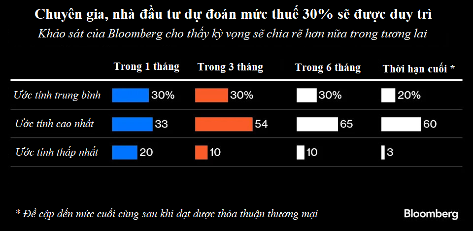 Triển vọng dài hạn vẫn nhiều bất định. Trong khi 7 người tham gia khảo sát kỳ vọng mức thuế sẽ giảm xuống dưới 30% trong vòng sáu tháng tới, thì 6 người lại cho rằng mức thuế sẽ còn tăng thêm. Nếu Mỹ và Trung Quốc đạt được thỏa thuận thương mại toàn diện, mức thuế có thể hạ xuống khoảng 20%, theo kết quả dự báo trung bình của khảo sát.