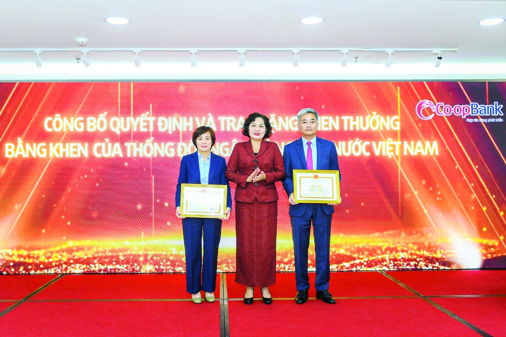 | Đồng chí Nguyễn Thị Hồng - Ủy viên BCH Trung ương Đảng, Thống đốc NHNN Việt Nam trao tặng bằng khen cho đồng chí Nguyễn Quốc Cường - Chủ tịch HĐQT Co-opBank và đồng chí Phạm Thị Hồng Minh - Tổng giám đốc Co-opBank |