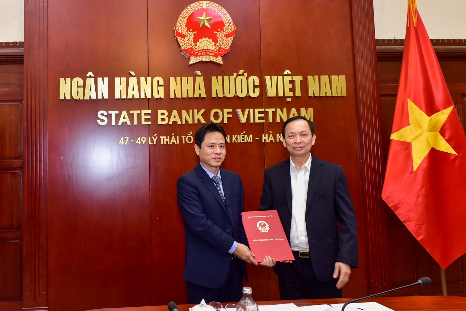 | Phó Thống đốc Thường trực Đào Minh Tú trao Quyết định và chúc mừng đồng chí Nguyễn Xuân Hải |