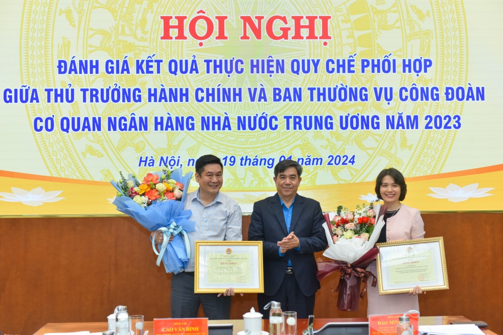 | Tại Hội nghị, nhiều tập thể, cá nhân đã được trao tặng Cờ thi đua và bằng khen. Cụ thể, tặng Cờ thi đua của Tổng Liên đoàn Lao động Việt Nam cho CĐCS Vụ Chính sách tiền tệ vì đã có thành tích xuất sắc trong phong trào thi đua lao động giỏi và xây dựng tổ chức công đoàn vững mạnh năm 2022; tặng Cờ thi đua của Tổng Liên đoàn Lao động Việt Nam cho CĐCS Vụ Thanh toán vì đã có thành tích xuất sắc trong phong trào thi đua “Giỏi việc ngân hàng, đảm việc nhà”; trao Bằng khen của Tổng Liên đoàn Lao động Viêt Nam cho Công đoàn Cơ quan NHNN Trung ương và CĐCS Cục Quản trị vì đã có thành tích xuất sắc trong phong trào thi đua lao động giỏi và xây dựng tổ chức công đoàn vững mạnh năm 2022; tặng Cờ thi đua của Công đoàn Ngân hàng Việt Nam cho các CĐCS: Chi Cục Phát hành và Kho quỹ, Trung tâm Thông tin tín dụng Quốc gia Việt Nam, Văn phòng NHNN vì đã có thành tích xuất sắc trong phong trào thi đua lao động giỏi và xây dựng tổ chức công đoàn vững mạnh năm 2022; tặng Cờ thi đua của Công đoàn Ngân hàng Việt Nam cho CĐCS Vụ Quản lý ngoại hối vì đã có thành tích xuất sắc trong phong trào thi đua “Giỏi việc ngân hàng, đảm việc nhà” năm 2022. |