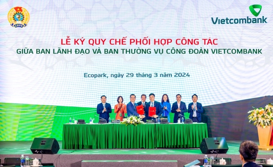 | Đ/c Chủ tịch HĐQT Nguyễn Thanh Tùng và đ/c Chủ tịch Công đoàn Hồng Quang thực hiện nghi thức ký Quy chế phối hợp hoạt động giữa Ban lãnh đạo Vietcombank và Ban thường vụ Công đoàn Vietcombank |