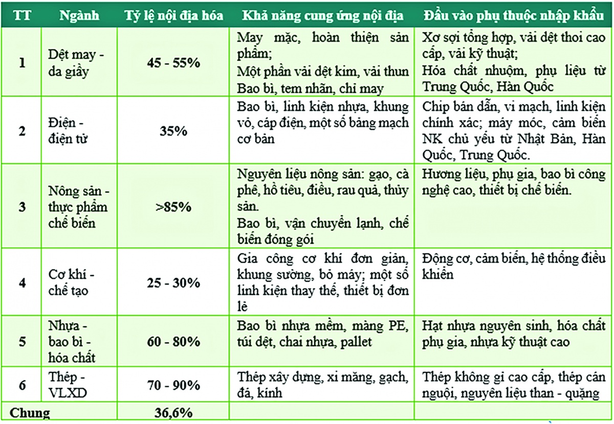 Việt Nam đã trở thành một mắt xích quan trọng trong chuỗi giá trị toàn cầu. Song mô hình tăng trưởng dựa nhiều vào gia công, lắp ráp giá trị gia tăng thấp đang bộc lộ giới hạn: tỷ lệ nội địa hóa sản xuất chung của Việt Nam mới khoảng 36,6% năm 2024 (theo Khảo sát của JETRO) – thấp hơn nhiều so với Trung Quốc, Thái Lan, Indonesia... Bên cạnh đó, theo WTO (công bố 11/2024 về số liệu đánh giá năm 2022), hàm lượng giá trị gia tăng nội địa trong xuất khẩu của một số mặt hàng xuất khẩu chủ lực còn ở mức thấp so với các nước trong khu vực và trên thế giới. Đơn cử trong ngành điện - điện tử (ngành thế mạnh chiếm 33,1% xuất khẩu của Việt Nam), hàm lượng giá trị gia tăng nội địa chỉ ở mức 26,9%, thấp hơn đáng kể so với Thái Lan (52,2%), Indonesia (61,2%), Ấn Độ (66%), Trung Quốc (75,3%)…