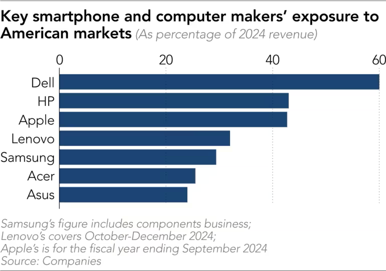 | Mức độ phụ thuộc thị trường của các nhà sản xuất điện thoại thông minh và máy tính chủ chốt đối với thị trường Mỹ. (Tính theo tỷ lệ phần trăm doanh thu năm 2024) |