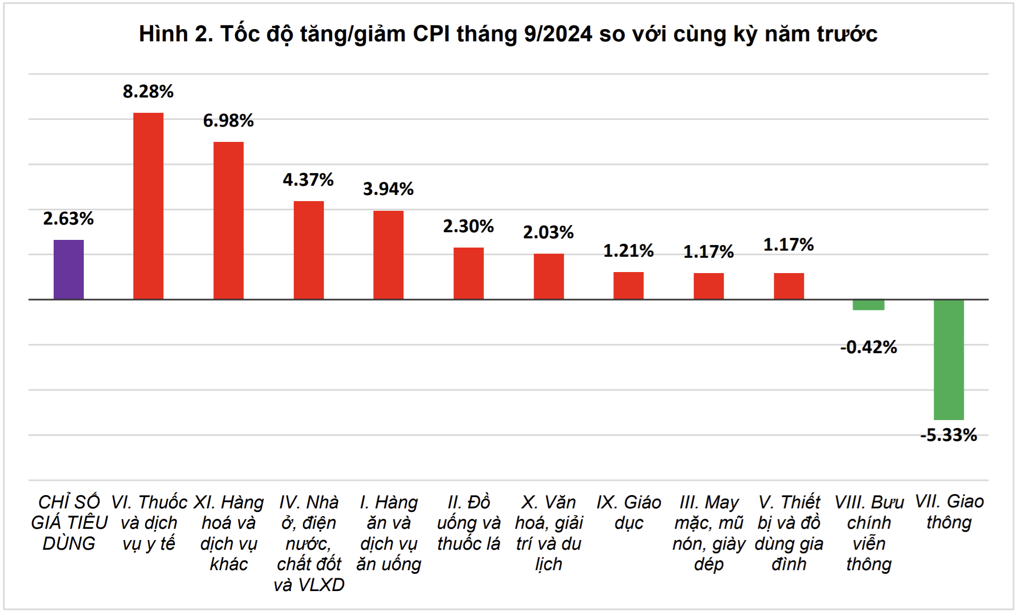 Theo báo cáo từ Tổng cục Thống kê, nguyên nhân chính dẫn đến sự tăng trưởng CPI tháng 9/2024 có thể được chia thành ba nhóm chính: (i) Tác động của thiên tai với giá lương thực và thực phẩm tăng cao, đặc biệt tại các tỉnh thành phố bị ảnh hưởng bởi bão Yagi và hoàn lưu bão vừa qua; (ii) Tăng học phí, một số địa phương đã điều chỉnh tăng học phí theo lộ trình của Nghị định số 97/2023/NĐ-CP và tháng 9 cũng là thời điểm bắt đầu năm học mới, dẫn đến nhu cầu về đồ dùng học tập gia tăng; (iii) Giá thuê nhà ở tăng, chủ yếu do nhu cầu thuê nhà tại một số địa phương tăng khi bước vào năm học mới.