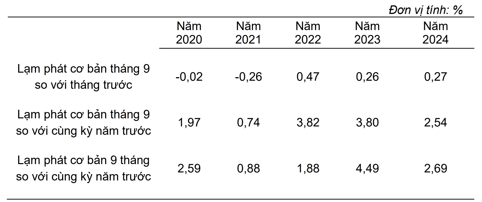 | Lạm phát cơ bản tháng 9 và chín tháng từ năm 2020 đến năm 2024 |