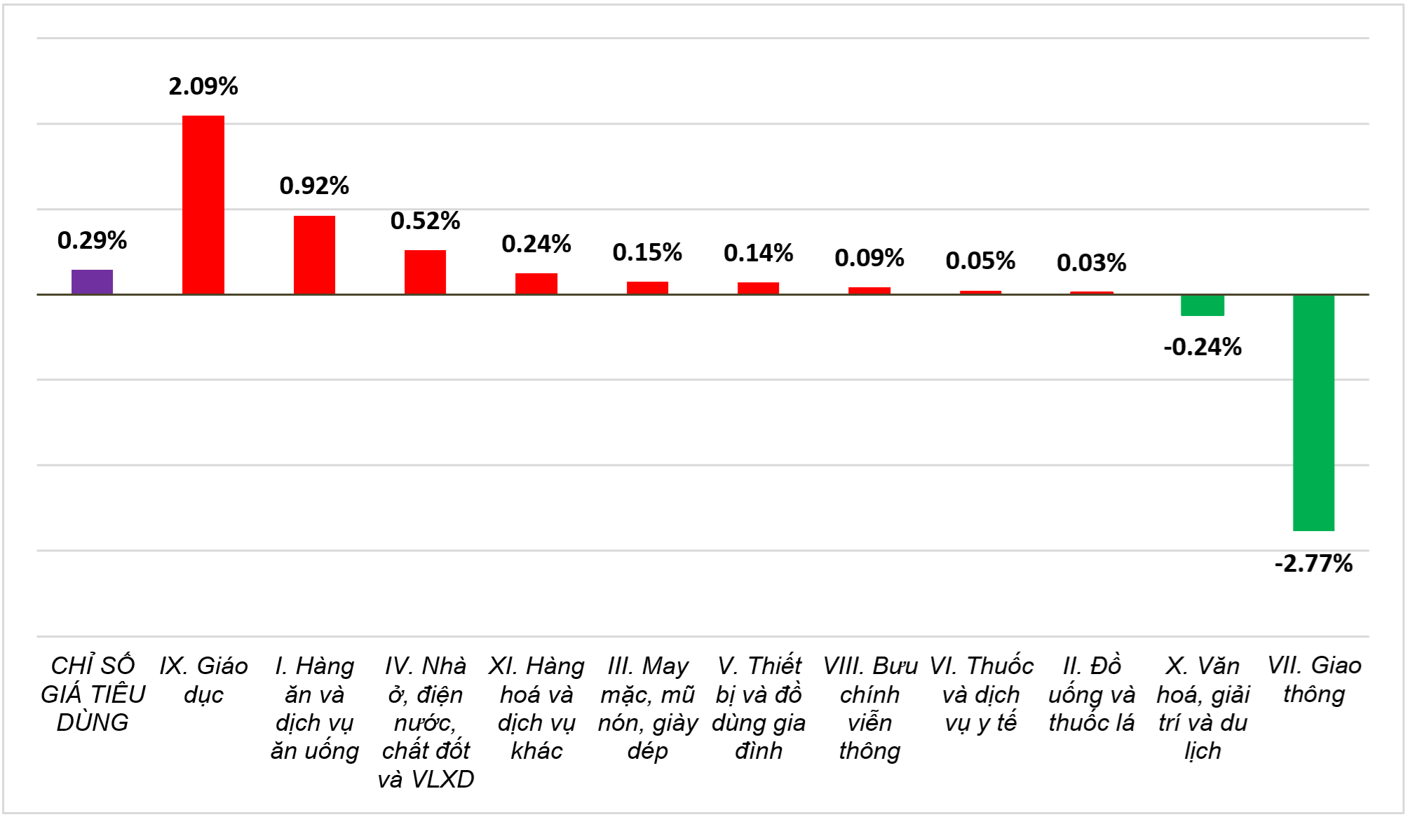 Trong mức tăng 0,29% của CPI tháng 9/2024 so với tháng trước, có 9 nhóm hàng hóa và dịch vụ có chỉ số giá tăng và 2 nhóm hàng có chỉ số giá giảm. Cụ thể, 9 nhóm hàng hóa và dịch vụ có chỉ số giá tăng gồm: Nhóm giáo dục tăng 2,09%; Nhóm hàng ăn và dịch vụ ăn uống tăng 0,92% (đóng góp 0,31% vào mức tăng CPI chung); Nhóm nhà ở, điện, nước, chất đốt và vật liệu xây dựng tăng 0,52%; Nhóm hàng hóa và dịch vụ khác tăng 0,24%; Nhóm may mặc, mũ nón và giày dép tăng 0,15%; Nhóm thiết bị và đồ dùng gia đình tăng 0,14%; Nhóm bưu chính, viễn thông tăng nhẹ 0,09%; Nhóm thuốc và dịch vụ y tế tăng 0,05%; Nhóm đồ uống và thuốc lá tăng 0,03%.
