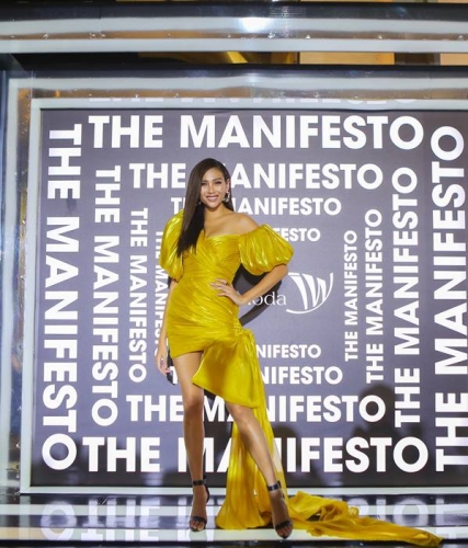 Người mẫu Ngọc Trinh được lựa chọn là người mẫu vedette của đêm diễn. Diện thiết kế đầm senora ôm sát cách điệu với bông hoà trà trước ngực và chiếc nơ bản to làm điểm nhấn sau lưng. Màn trình diễn của Ngọc Trinh được xem là một cái kết đẹp của show diễn Manifesto.