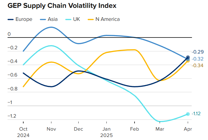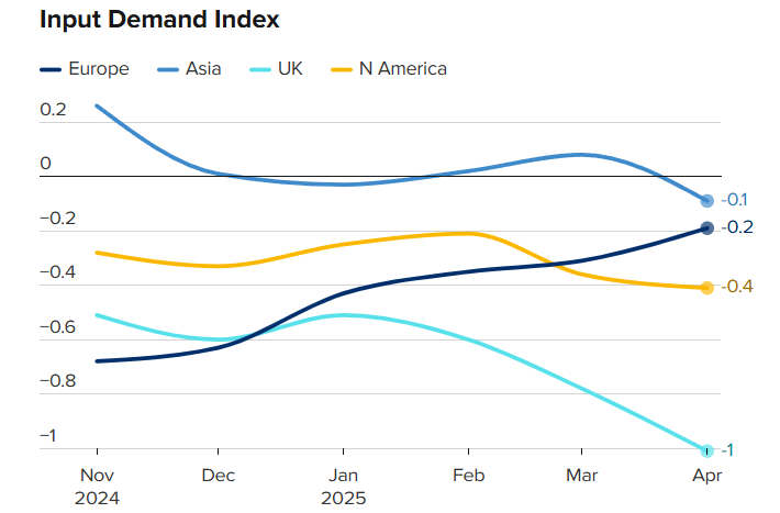 Một điểm sáng để bù đắp cho sự sụt giảm trong sản xuất là châu Âu, nơi suy thoái công nghiệp sắp kết thúc. Mặc dù Vương quốc Anh, quốc gia đầu tiên ký thỏa thuận thương mại sơ bộ với Mỹ, đã ghi nhận sự yếu kém đáng kể trong sản xuất, với hoạt động của nhà cung cấp giảm xuống mức gần mức thấp kỷ lục dựa trên dữ liệu của hai thập kỷ qua; nhưng năng lực chuỗi cung ứng tại Đức và Pháp, vốn đã không được sử dụng hết trong năm qua, đang phản ánh sự tăng trưởng.