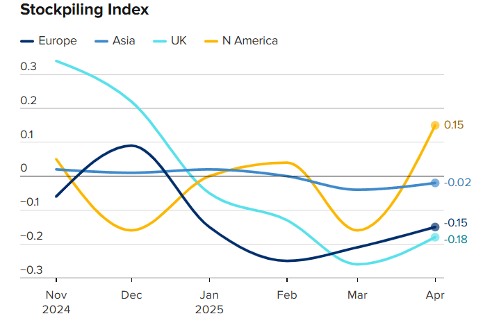 Theo Piatek, dữ liệu cho thấy sự gia tăng giống như “cây gậy khúc côn cầu” vào tháng 4, khi các công ty Bắc Mỹ tích cực tích trữ hàng tồn kho với mức mà ông mô tả là “đáng lo ngại”. Đồng thời, ông cho biết “những dấu hiệu đầu tiên cho thấy các nhà sản xuất dự đoán nhu cầu chậm lại và tình trạng thiếu hụt nguồn cung đã xuất hiện”.