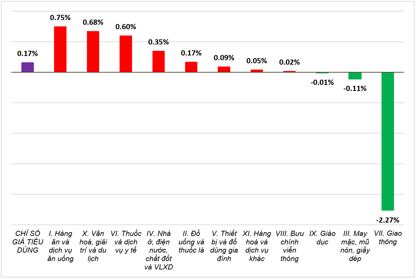 Đáng chú ý, Nhóm giao thông giảm 2,27% (góp phần giảm CPI chung 0,22%), chủ yếu do: Giá nhóm phương tiện đi lại giảm 0,17%; giá dầu diezen giảm 0,95%; giá xăng giảm 5,86% do ảnh hưởng của các đợt điều chỉnh giá trong tháng. Ở chiều ngược lại, có một số nhóm hàng tăng giá: Giá vận tải hành khách bằng đường sắt tăng 2,04%; đường bộ tăng 0,16%; vận tải hành khách bằng taxi tăng và vận tải hành khách kết hợp tăng 0,03% do nhu cầu đi lại dịp hè tăng; phí học bằng lái xe tăng 0,01% do nhu cầu tăng.
