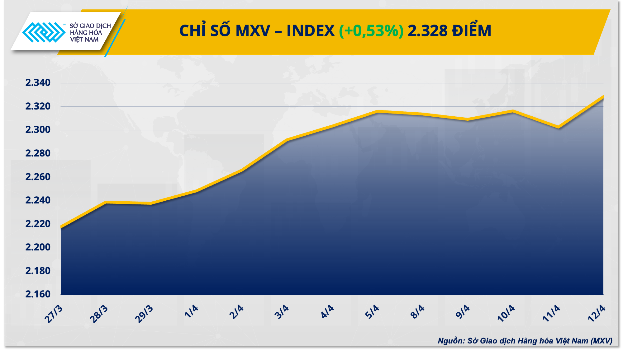 Lực bán chiếm ưu thế trên nhóm nông sản và năng lượng; tuy nhiên đà tăng mạnh của nhóm kim loại và nguyên liệu công nghiệp đã hỗ trợ chỉ số MXV-Index chốt tuần tăng 0,53% lên 2.328 điểm, cao nhất trong vòng 7 tháng.
