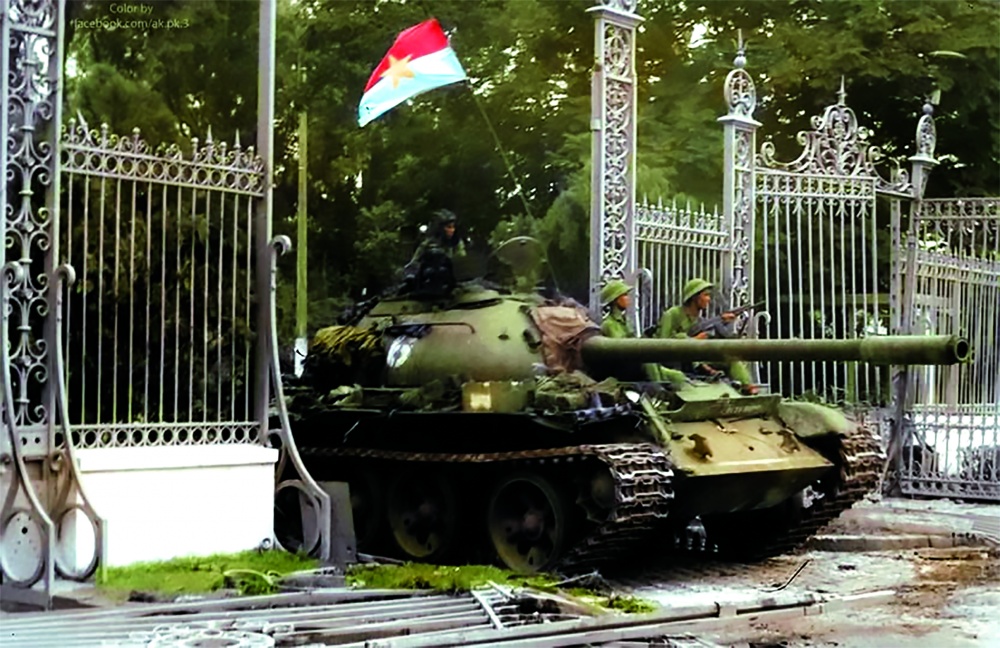 | Xe tăng quân giải phóng húc đổ cánh cửa thép tiến vào Dinh Độc lập |