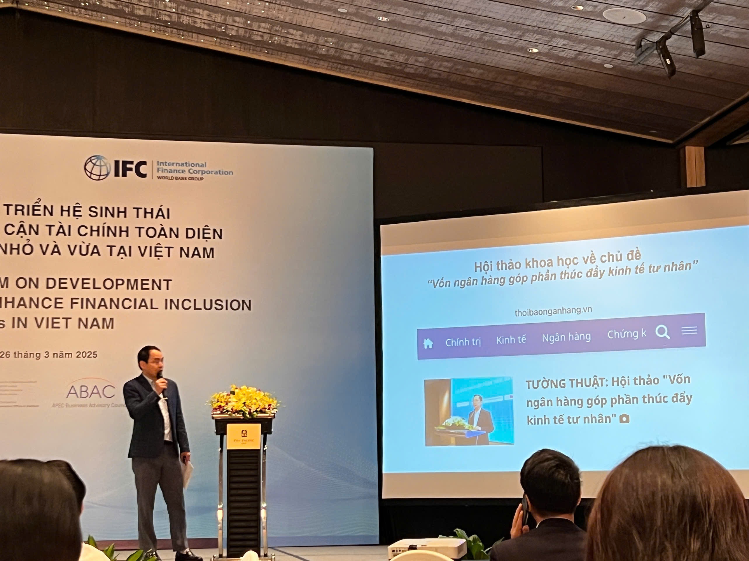Ông Trần Anh Quý: Tính đến cuối năm 2024, dư nợ tín dụng dành cho doanh nghiệp tư nhân tại các tổ chức tín dụng đạt gần 7 triệu tỷ đồng, tăng khoảng 14,7% so với năm 2023 và chiếm 44% tổng dư nợ tín dụng toàn nền kinh tế. Trong đó, có 100 tổ chức tín dụng có dư nợ tín dụng đối với doanh nghiệp nhỏ và vừa với tổng dư nợ đạt 2,74 triệu tỷ đồng, tăng 10,7% và chiếm 17,6% tổng dư nợ. Hiên có 103/120 tổ chức tín dụng phát sinh dư nợ tín dụng đối với doanh nghiệp nhỏ và vừa, trong đó khối ngân hàng thương mại nhà nước chiếm 41,6%, khối ngân hàng thương mại cổ phần chiếm 54,2%, khối ngân hàng nước ngoài chiếm 2,4%, các tổ chức tín dụng khác chiếm 1,8%.