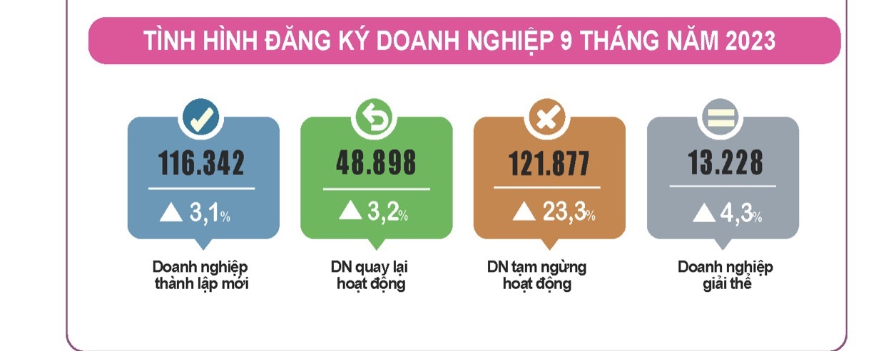 Tính chung 9 tháng, số doanh nghiệp tạm ngừng kinh doanh có thời hạn là 75,8 nghìn doanh nghiệp, tăng 21,2% so với cùng kỳ năm trước; 46,1 nghìn doanh nghiệp ngừng hoạt động chờ làm thủ tục giải thể, tăng 26,9%; 13,2 nghìn doanh nghiệp hoàn tất thủ tục giải thể, giảm 4,3%. Bình quân một tháng có 15 nghìn doanh nghiệp rút lui khỏi thị trường.