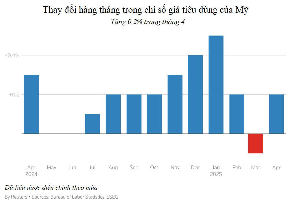 Số liệu được Bộ Lao động Mỹ công bố cho thấy, mức tăng giá trong tháng 4 thấp hơn dự báo của giới phân tích và tác động từ các mức thuế nhập khẩu diện rộng của Tổng thống Trump vẫn chưa rõ nét, dù giới chuyên gia dự báo ảnh hưởng sẽ rõ ràng hơn từ giữa năm nay.