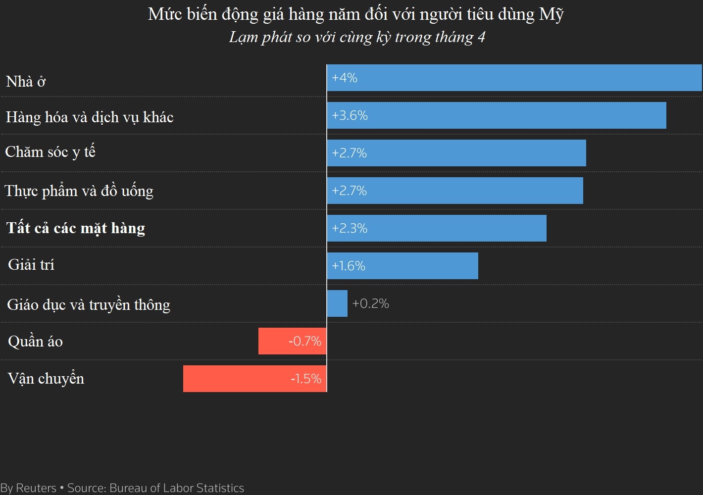 Chỉ số CPI lõi - loại trừ hai nhóm hàng biến động mạnh là thực phẩm và năng lượng - tăng 0,2% trong tháng 4 sau khi tăng 0,1% tháng trước. CPI lõi được hỗ trợ bởi chi phí nhà ở tăng 0,4%, trong đó chi phí quy đổi thuê nhà cho chủ sở hữu (owners’ equivalent rent) tăng mạnh, bù đắp cho mức giảm 0,1% của giá khách sạn và nhà nghỉ.