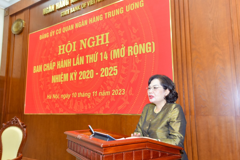Phát biểu quán triệt nội dung Hội nghị, đồng chí Nguyễn Thị Hồng - Ủy viên BCH Trung ương Đảng, Bí thư Ban Cán sự Đảng, Bí thư Đảng ủy cơ quan NHTW, Thống đốc NHNN cho biết, trong bối cảnh tình hình kinh tế thế giới và trong nước vẫn diễn biến phức tạp, khó lường, trong 9 tháng đầu năm 2023 và tháng 10 vừa qua, ban lãnh đạo NHNN đã chỉ đạo quyết liệt để thực hiện hiệu quả các nhiệm vụ chính trị của ngành Ngân hàng được Chính phủ, Thủ tướng Chính phủ giao.